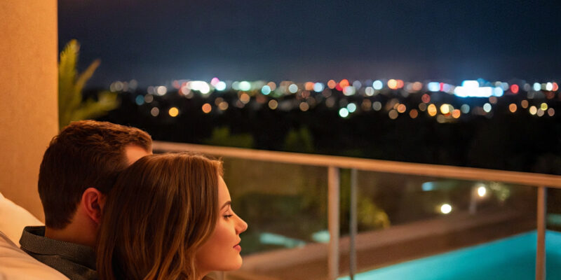 Hotel room, soft lighting, balcony से शहर की रोशनी झलक रही थी।confined space aur slightly open-ish view ने forbidden thrill aur blush-filled teasing create किया।evening, wine aur mellow music ने mood intimate aur suspenseful बना दिया था।